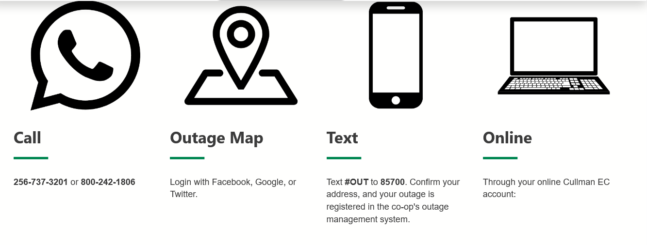 To report an outage, call 256-737-3201 or 800-242-1806 or text #OUT to 85700. Confirm your address, and your outage will be registered in the CEC‘s outage management system.