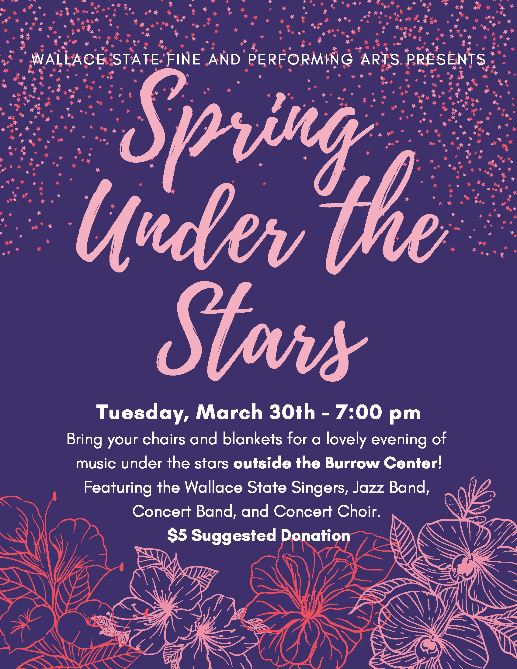 HANCEVILLE, Ala. —The Wallace State Community College Fine and Performing Arts program announces, “Spring Under the Stars,” a performance featuring the Wallace State Singers, Jazz Band, Concert Band and Concert Choir. The outdoor concert will be held on Tuesday, March 30 at 7 p.m., in front of the Burrow Center for the Fine and Performing Arts.