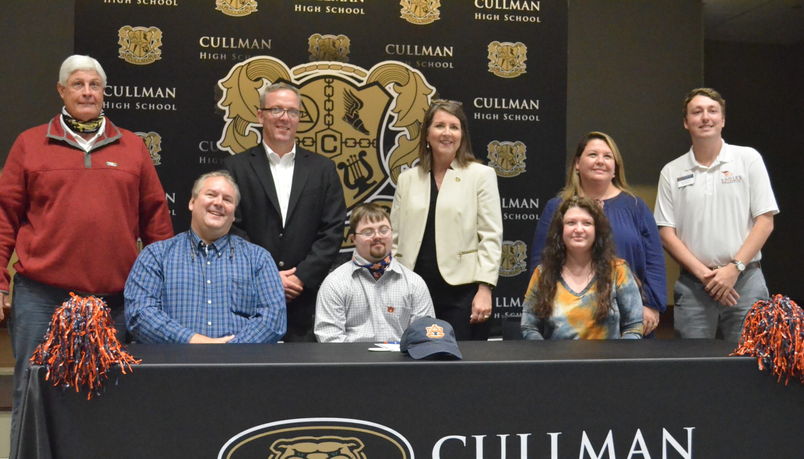 CULLMAN, Ala. – Tuesday was a special day for many people at Cullman High School but none more so than Jackson Ray. Ray was joined by friends, family, teachers, coaches and more in Cullman High School’s Tillman Hall Tuesday afternoon to sign a scholarship to join Auburn University’s EAGLES program. The Education to Accomplish Growth in Life Experiences for Success, or EAGLES, is a comprehensive transition program (CTP) for students with intellectual disabilities. The program provides a post-secondary education opportunity for students with intellectual disabilities to engage in a two or four-year campus experience to help students achieve their employment and independent living goals upon successful completion of the program.
