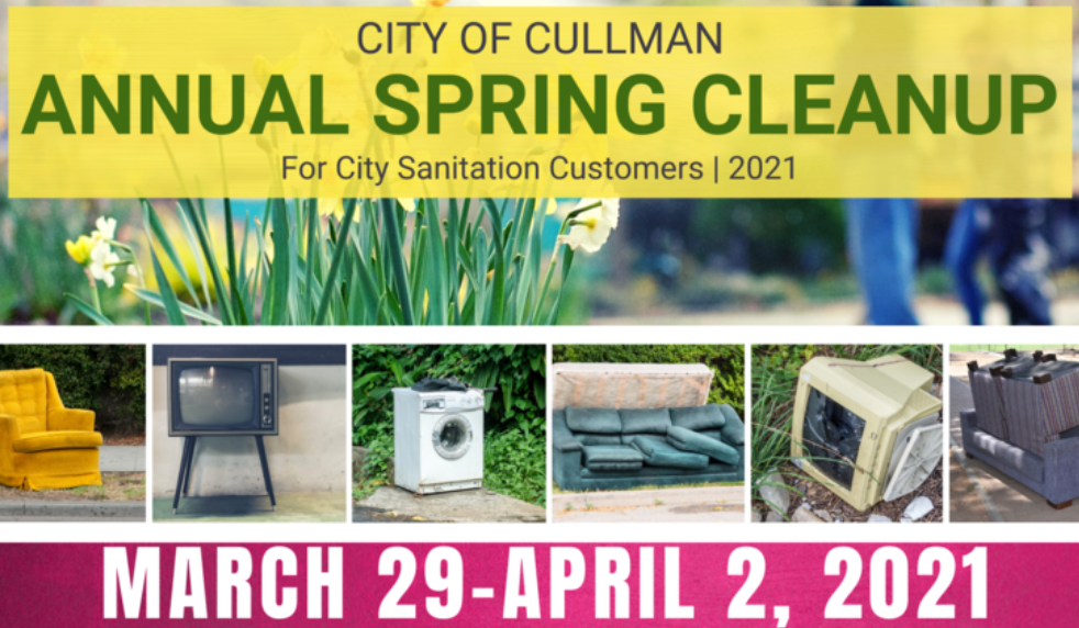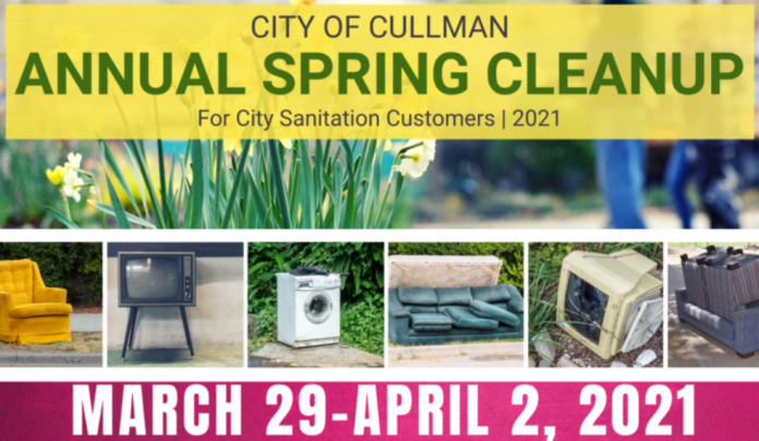 ⯠CULLMAN, Ala. – The City of Cullman is reminding residents that next week, March 29 through April 2, 2021 is the Cityās annual Spring Cleanup. Place your old unwanted appliances, furniture, mattresses and other large items curbside, and crews will be picking up these items throughout the week (separately from your regular garbage and recycling). This service is provided to customers at no extra cost.