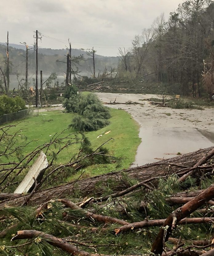 The park suffered widespread tree damage in areas near Alabama Highway 119, as well as damage to the park’s campground and cable skiing areas. No injuries were immediately reported.