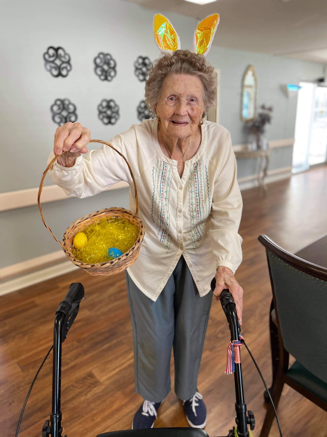 What did you enjoy most about Easter as a child? Well, we didn’t have much. I was on a poor man’s farm. My dad was a farmer. We would have a dinner on Easter. One thing I remember the most, we moved into a house that dad built for us that week. I was 9 years old. My first cousin had his birthday that weekend and we had an Easter egg hunt behind his house. I guess it was a pasture. They hid the eggs and let all us kids tear out there and hunt them. Everyone hunted and hunted but couldn’t find an Easter egg. Some of them hid them, one of the girls- she was still a teenager- she walked down the hill just a few feet and stepped on some grass. The grass turned over a little bit. Being an ol’ country girl, I thought that was unusual. I walked down there and pulled up that grass and there was an Easter egg under it. I was so thrilled! First time I could remember being at an Easter egg hunt away from home. I still have that rabbit. He’s losing his paint and every time we do anything with changing or redoing things in the house, I always save my rabbit. It had jelly beans in it. It was about 8 inches high and then, there was an Easter basket in front of him that he had his jelly beans in. I remember that so well. My first exciting Easter egg hunt.