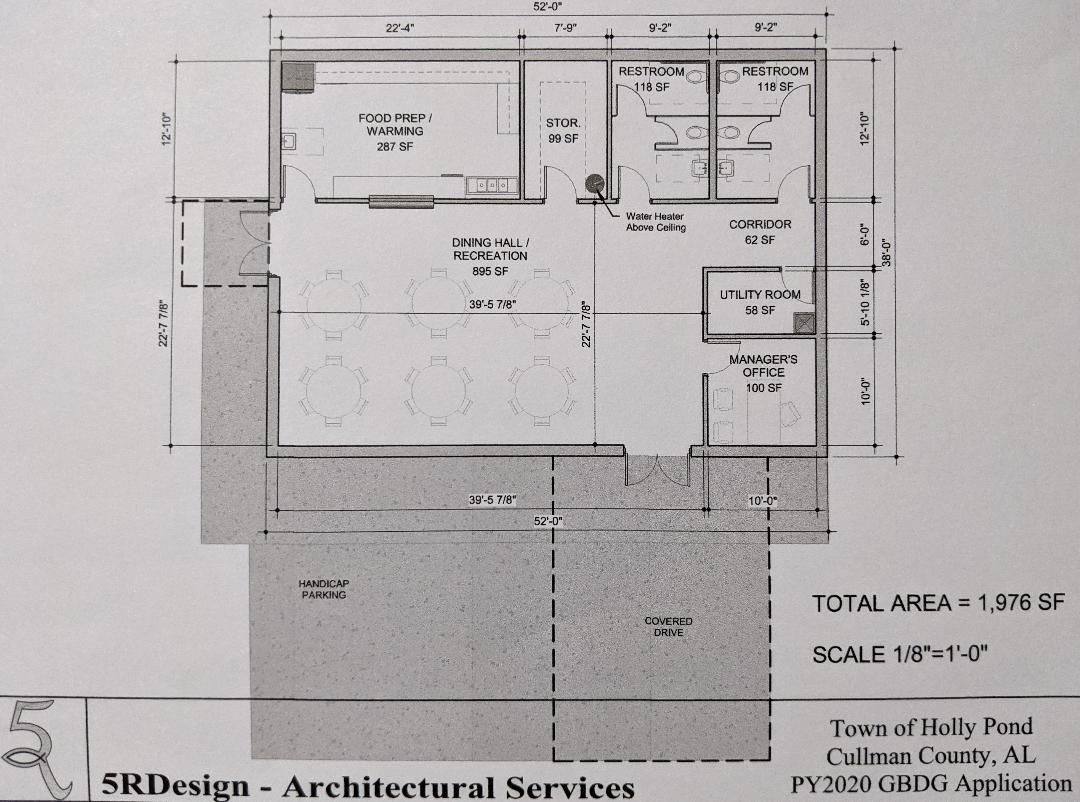 HOLLY POND, Ala. – The Holly Pond Town Council on Monday evening approved the design for the community’s new senior center that will be located near the Guy Hunt Library on the town’s west side. Based on a plan submitted by 5RDesign, the 2,000 square foot building will feature an 895 square foot dining/recreation room, 287 square foot kitchen and large double doors on the south and east sides. The east entrance will have a drive-through canopy and nearby handicap parking.