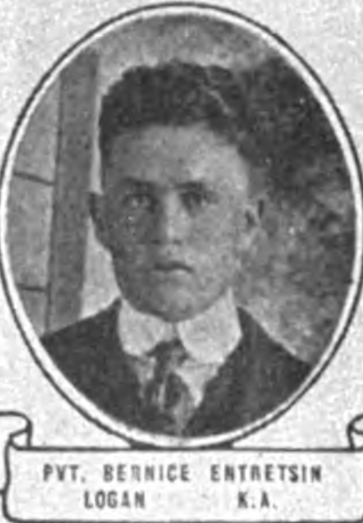 Bernice Entrekin was born December 6, 1895 in Carroll County, Georgia. By the age of 8, his family had relocated to Cullman County and settled in Logan. He entered into service with the United States Army on May 28, 1918. He was a member of Company F, 306 Engineers Regiment, 81st Division.
