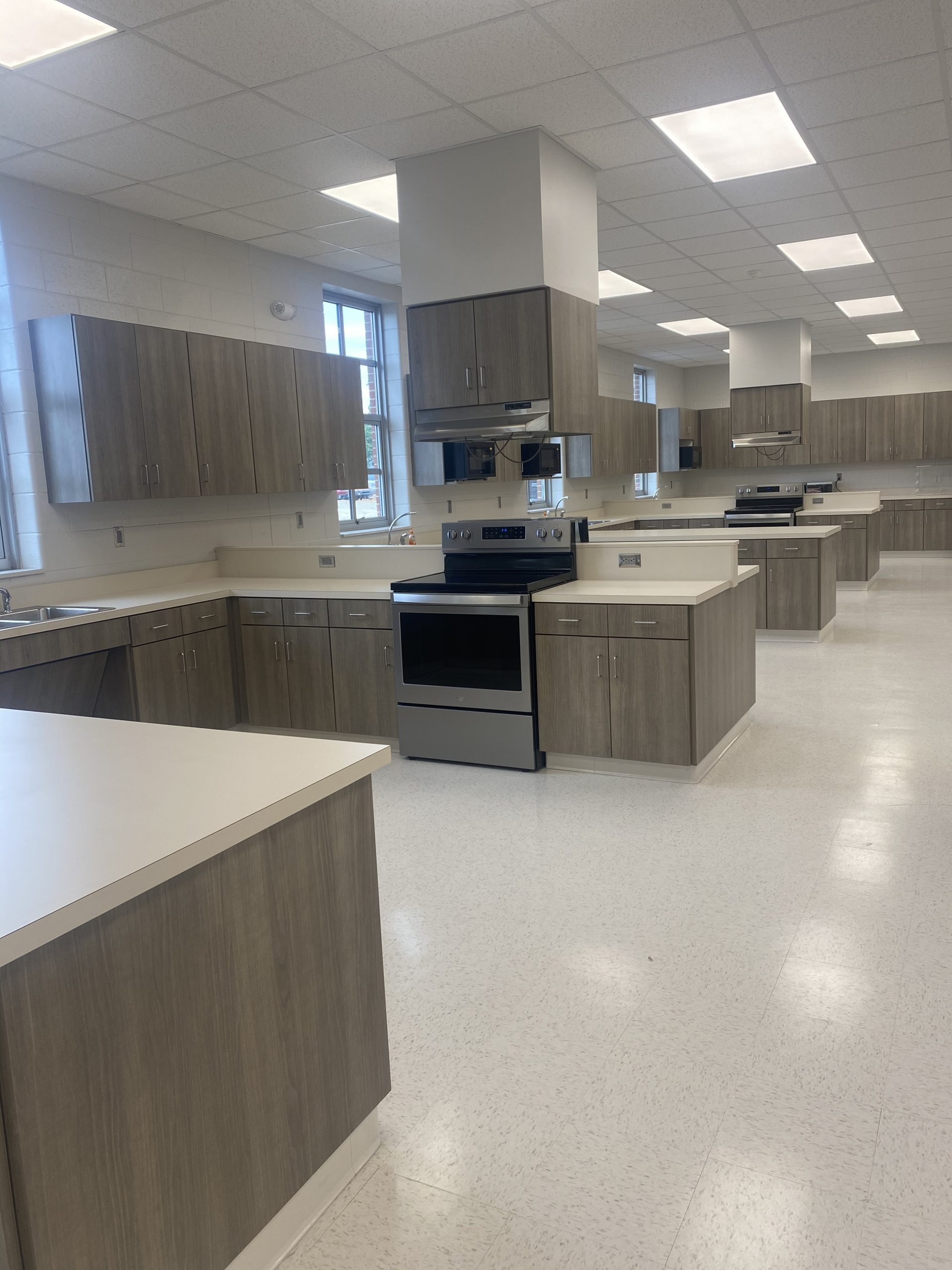 With Home Economics classes average of 25 students, they often crowd together in the four available kitchen learning spaces in the previous classroom. Now, with five brand-new spacious kitchens, the students can disperse more evenly and be closer to the learning process. Every kitchen is designed to be handicap accessible so all students may have the opportunity to learn use the space. The kitchen areas also come with new exhaust fans above each stove, which provides the classroom with proper ventilation while students are cooking. The new classroom also comes with both a washer and a dryer unit, enabling the students to practice everyday life skills.