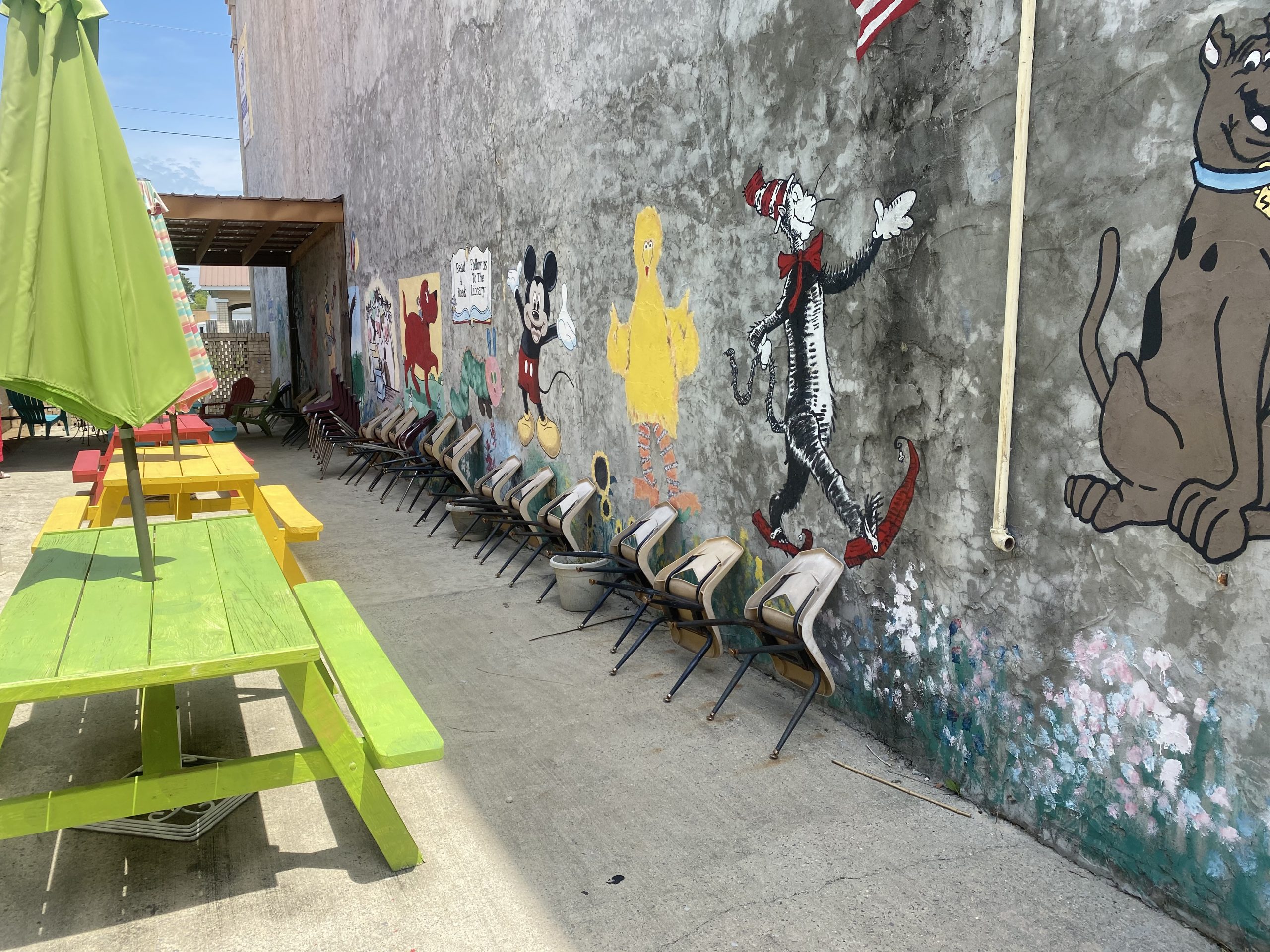 The hidden treasure of Hanceville Public Library is the beautiful outdoor space they have worked tirelessly to cultivate for the enjoyment of the children. It’s decorated with cartoon murals, colorful picnic tables and a beautiful wooden awning with built-in fan to provide shade and cool from notorious Alabama heat.