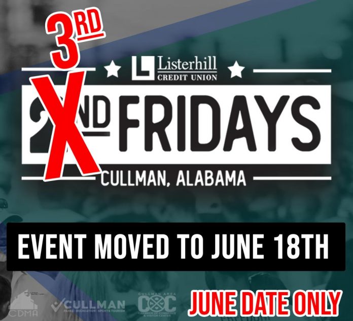 CULLMAN, Ala. – The Cullman Area Chamber of Commerce has announced that 2nd Friday has been rescheduled to June 18th, due to the weather.