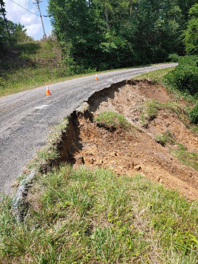 STOUTS MOUNTAIN, Ala. – Heavy weekend rains brought by the remnants of tropical storm Claudette washed away the shoulder and edge of the road surface on County Road 522 on Stouts Mountain. According to the Cullman County Road Department, the slide displaced an extensive amount of earth, and repairs will not happen quickly.