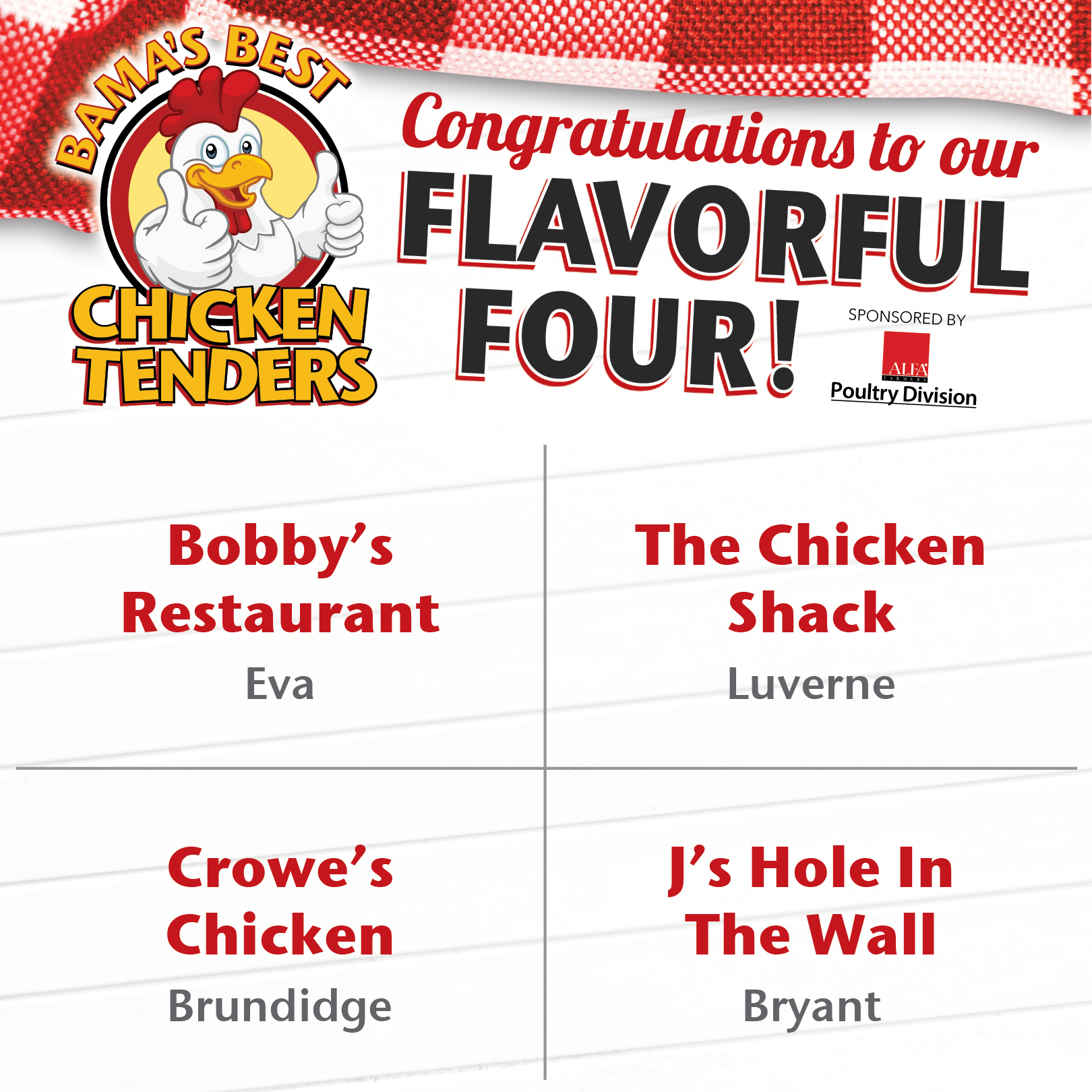 “These four finalists definitely have something to crow about,” said Russ Durrance, Alabama Farmers Federation Poultry Division director. “They obviously have hundreds, even thousands, of loyal customers who love their chicken tenders, and the farmers we represent are glad to do their part to provide a tasty product to these restaurants.”