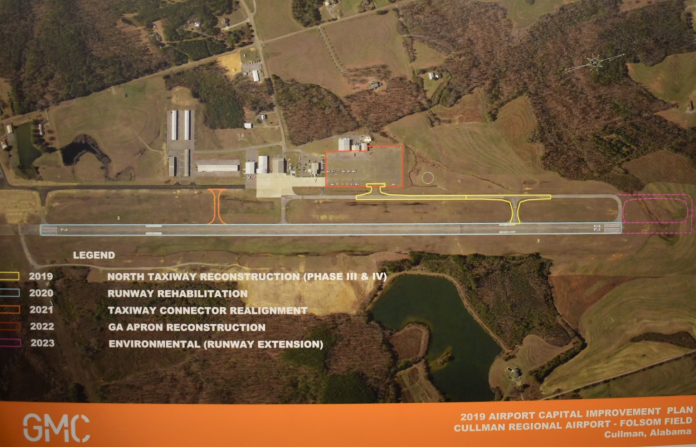 While no safety issues were identified with the runway concerning its current aircraft loads, Harrison said in 2019 that it has “currently a few weak spots.” The planned improvement will alleviate those issues and allow the runway to handle heavier aircraft than it does at this time. One of the main goals of the overall project, from its inception, has enabled all of the paved surfaces of the airport to support the weight of larger and heavier aircraft, to help make the Cullman area more accessible and attractive to existing and potential future industries.