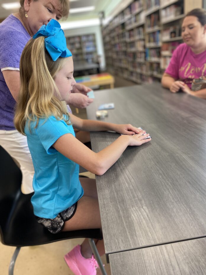 CULLMAN, Ala. – Renee Welsh from the Friends of the Public Library continued the library’s summer fun as she led local children in cardmaking at the Cullman County Public Library Tuesday morning. With cardstock, a wide range of stamps and some double-sided tape, she led several children, and even a few library associates, in this personalized creative process.