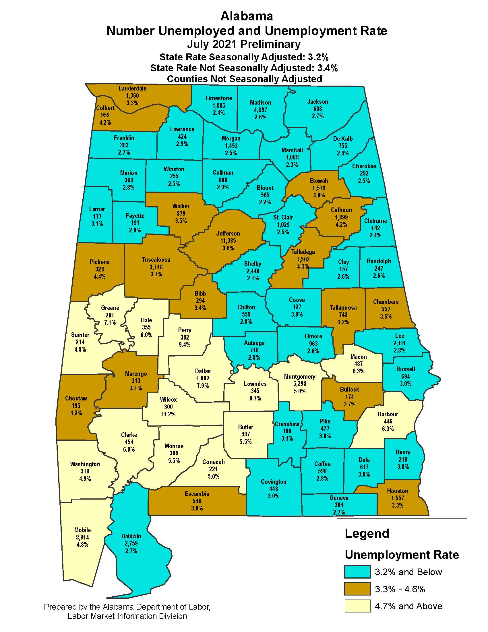 MONTGOMERY, Ala. – Governor Kay Ivey and Alabama Department of Labor Secretary Fitzgerald Washington announced Friday that Alabama’s preliminary, seasonally adjusted July 2021 unemployment rate is 3.2%, down from June’s rate of 3.3%, and well below July 2020’s rate of 7.4%. July’s rate represents 71,627 unemployed persons, compared to 73,769 in June and 165,510 in July 2020. Alabama remains below the July national rate of 5.4%.
