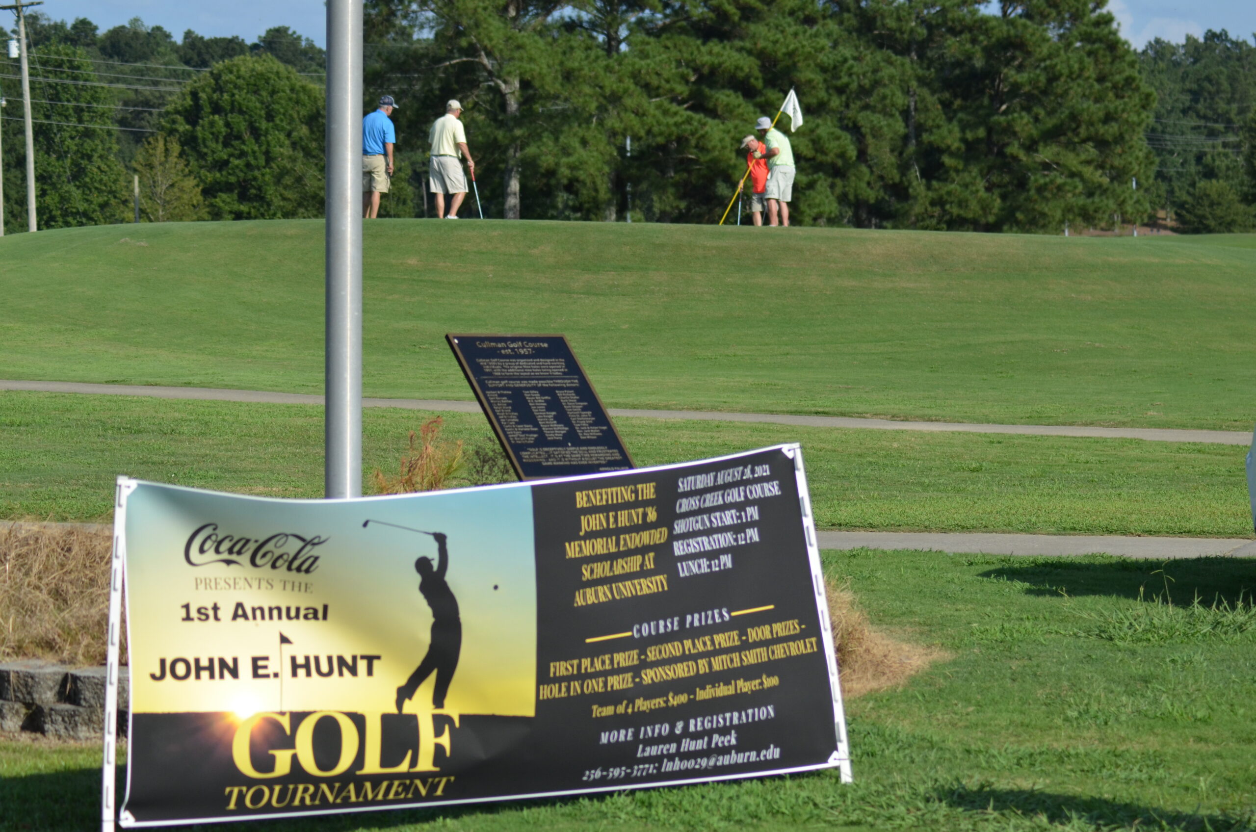 CULLMAN, Ala. – Cross Creek Golf Course was packed for the inaugural John E. Hunt Golf Tournament Saturday with 34 teams made up of 136 players out on the course competing. The proceeds from the tournament go towards each year’s John E. Hunt Memorial Scholarship fund. The first scholarship was awarded to Cort Chandler earlier this summer and after a successful first tournament Saturday, next year’s scholarship is well on its way to being funded.