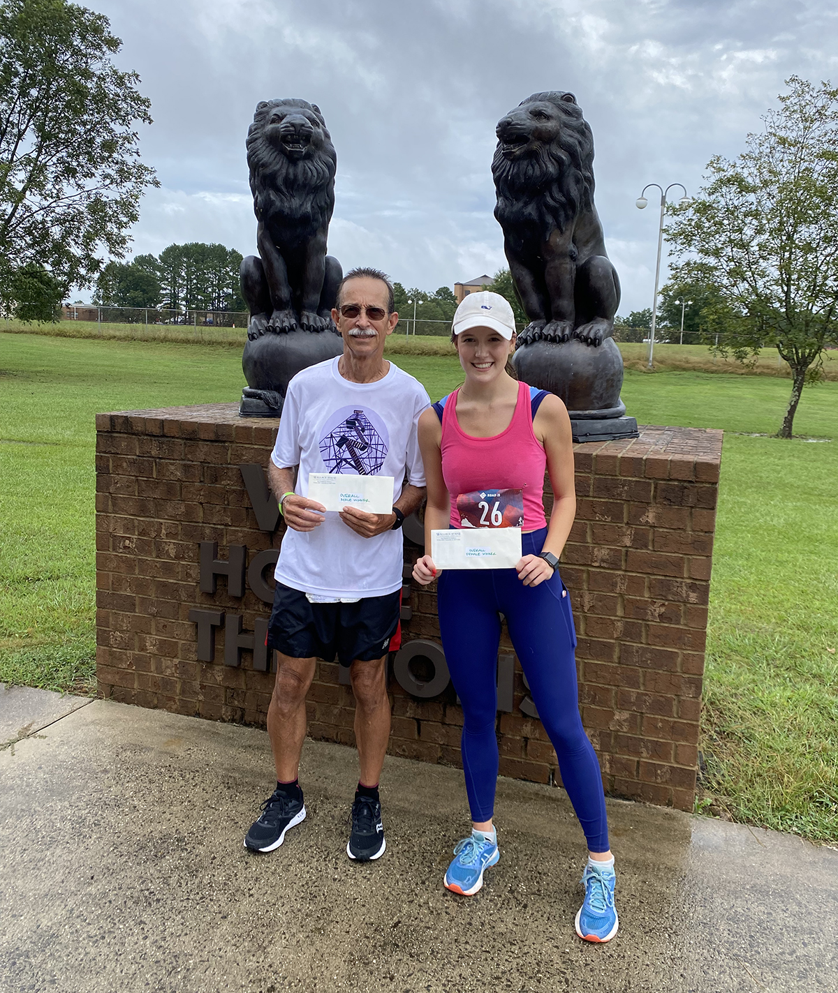The top male finisher of the Wallace State PTK 5K Miles for Meals race was Barry Ege, left, of Hanceville with a time of 21:00 minutes. The top female finisher was WSCC Business Management major Karla Hildebrand, right, of Athens, with a time of 31:16. (Photos courtesy of WSCC)