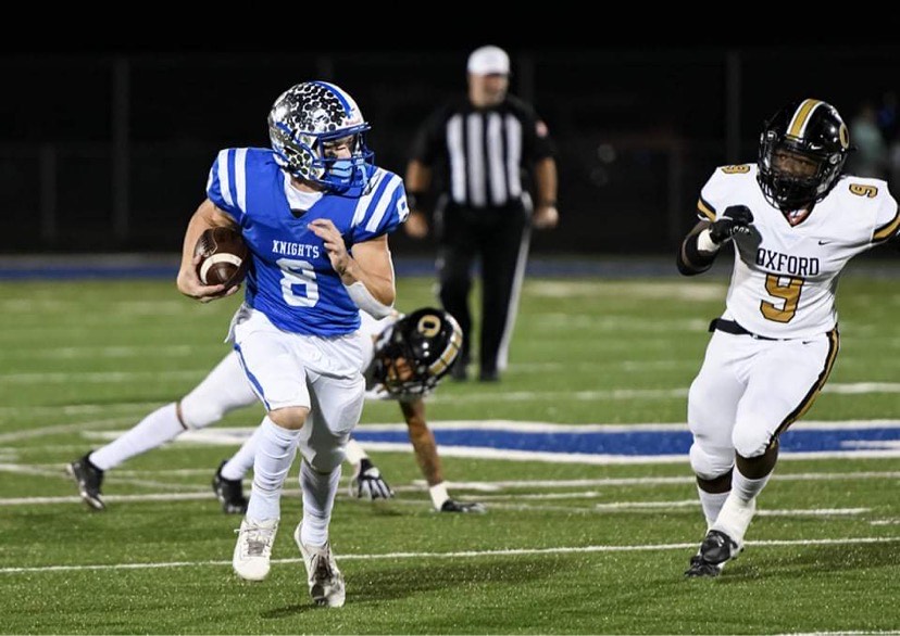 The Knight defense forced a quick three-and-out on its opening possession and their offense got started at the 43-yard line. They got off to a strong start offensively as Hayden O’Reilly picked up eight yards on the first play and then Ed Johnson found Wes Johnson for a gain of 34 yards, which put Arab at the 15. But the Oxford defense stiffened after that and the Knights’ Gavin Currier drilled a 28-yard field goal to put the Knights on the board first with a little less than eight minutes to go in the opening period.