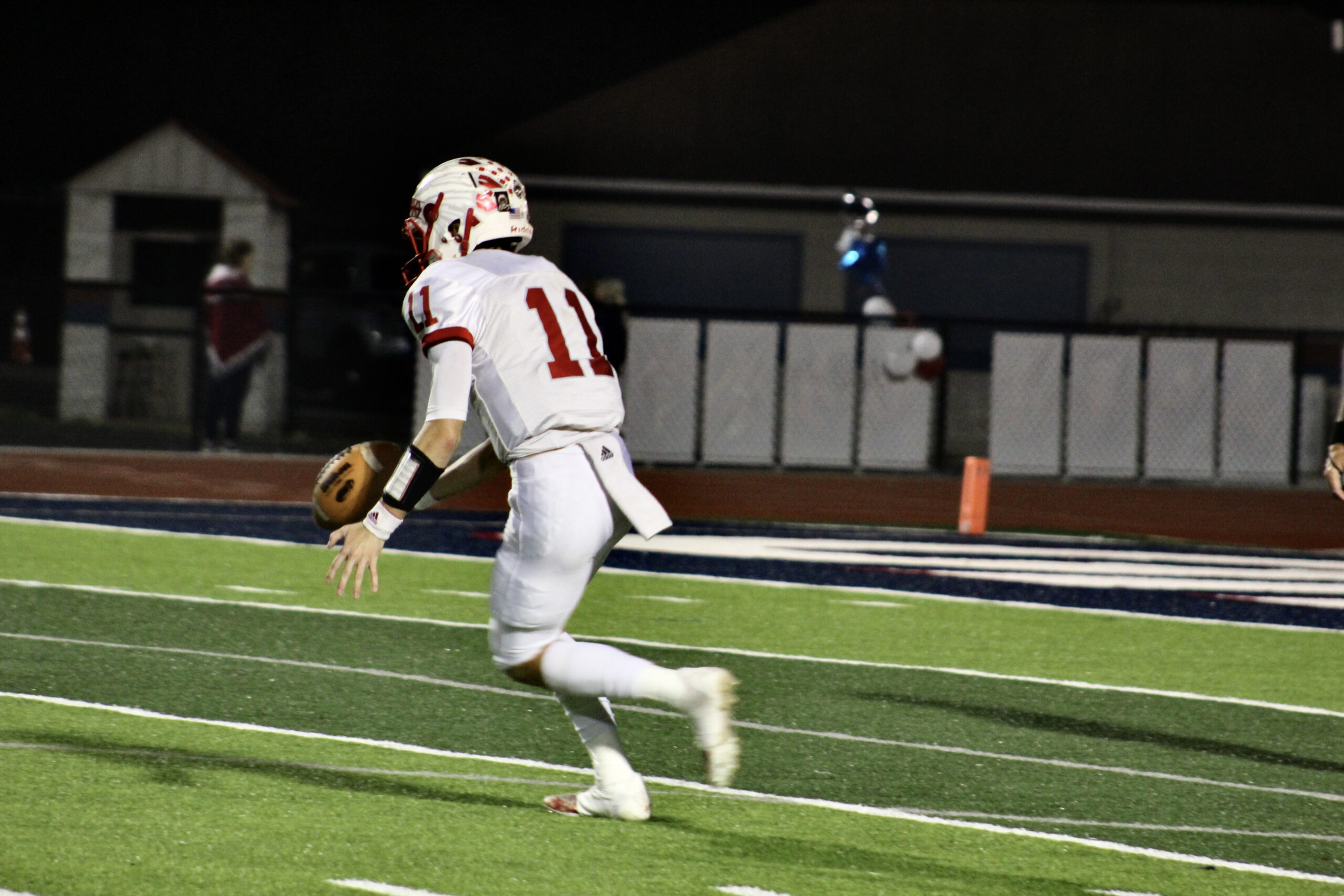 Good Hope QB Tanner Malin (11) posted a 54-yard touchdown run in the Raiders’ 37-19 loss at Oneonta Friday night. (Maddie McKenney/The Cullman Tribune)