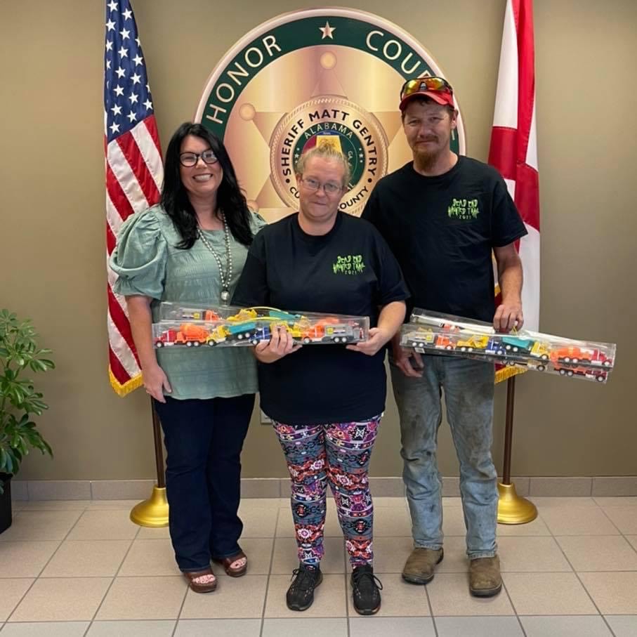 According to the CCSO, Angelia Selvage runs the entertainment venture Dead End Haunted Trail during the Halloween season, and the proceeds go to help pay for the toys. They have given these donations to the Sheriff’s Office for the past five to six years. This year they brought a trailer full of toys.