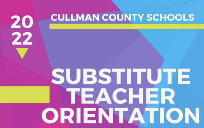 CULLMAN COUNTY, Ala. – Cullman County Schools will be holding an orientation for 2022’s substitute teachers on Jan. 11, 12 and 18. The orientations will be held in two different time sessions, the first being at 8-11 a.m., and the second from noon – 3 p.m. This orientation event will be held at the Cullman County Board of Education, located at 402 Arnold St. NE. Â