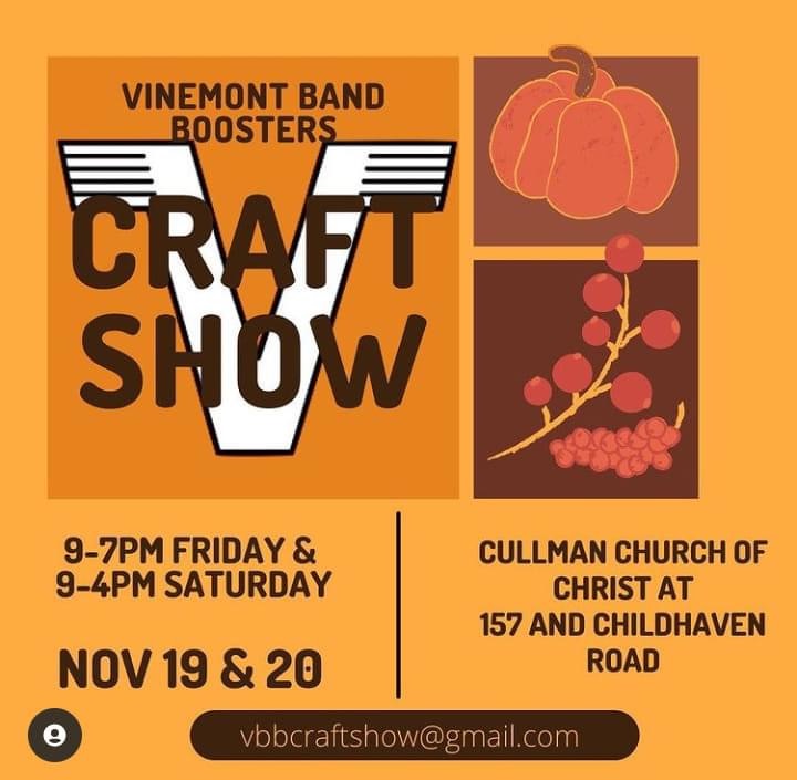 VINEMONT, Ala. – The Vinemont Band Boosters will be hosting a Craft Show at Cullman Church of Christ, located at the intersection of U.S. Highway 157 and Childhaven Road. The Craft Show will take place Nov. 19-20 and will last from 9 a.m. – 7 p.m. on Friday and 9 a.m. – 4 p.m. on Saturday.