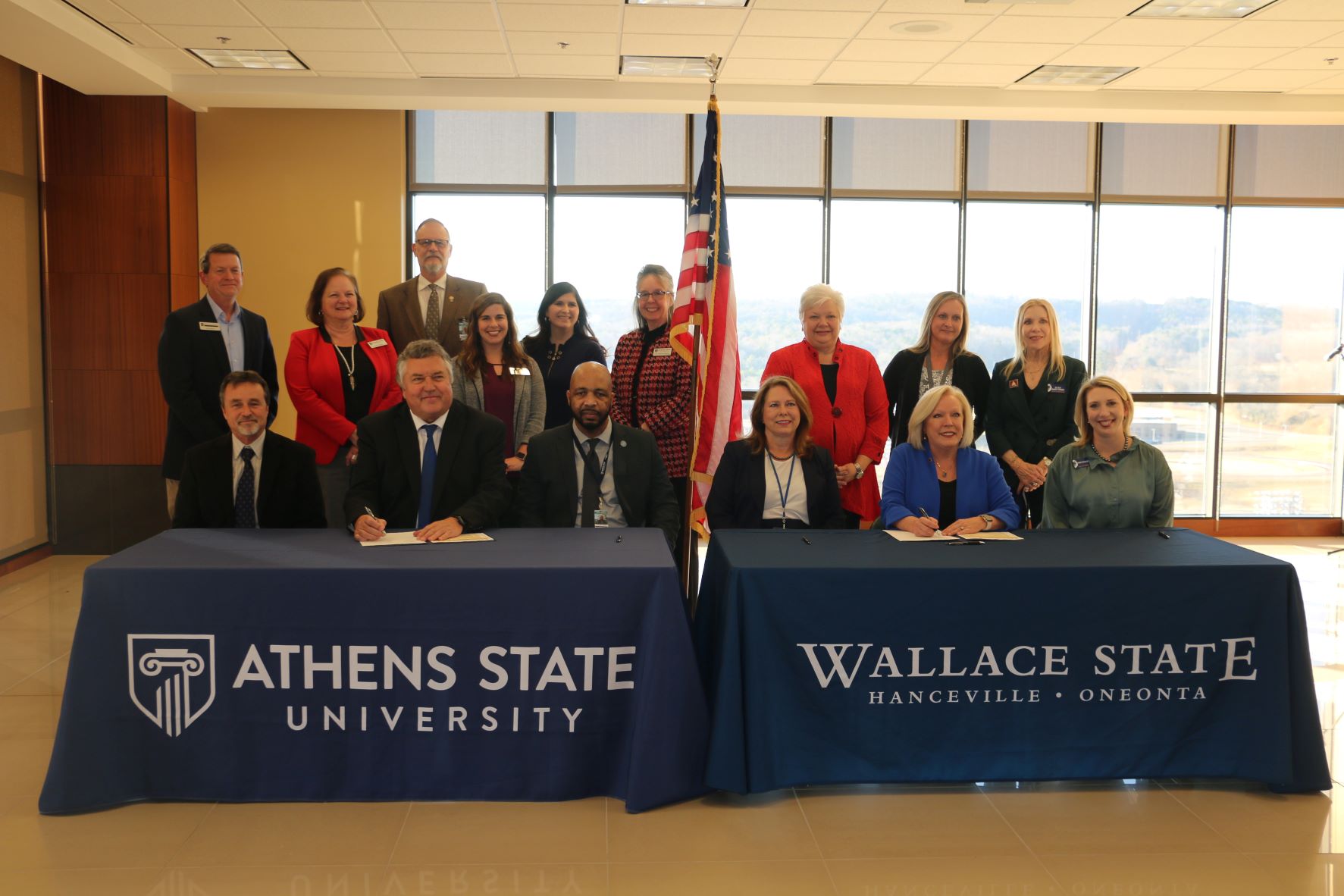 College representatives from Wallace State Community College and Athens State University recently signed a new articulation agreement at the 12th floor of the James C. Bailey Center at Wallace State. (WSCC)