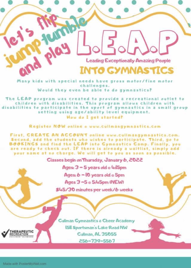 CULLMAN, Ala. – Cullman Gymnastics and Cheer Academy is holding a new six-week LEAP program beginning Thursday, January 6. The Leading Exceptionally Amazing People, or LEAP, program was created in partnership with the Cullman Therapeutic Recreation Program to provide a recreational outlet for children with disabilities. This program allows children with disabilities to participate in the sport of gymnastics in a small group setting using age/ ability level equipment.