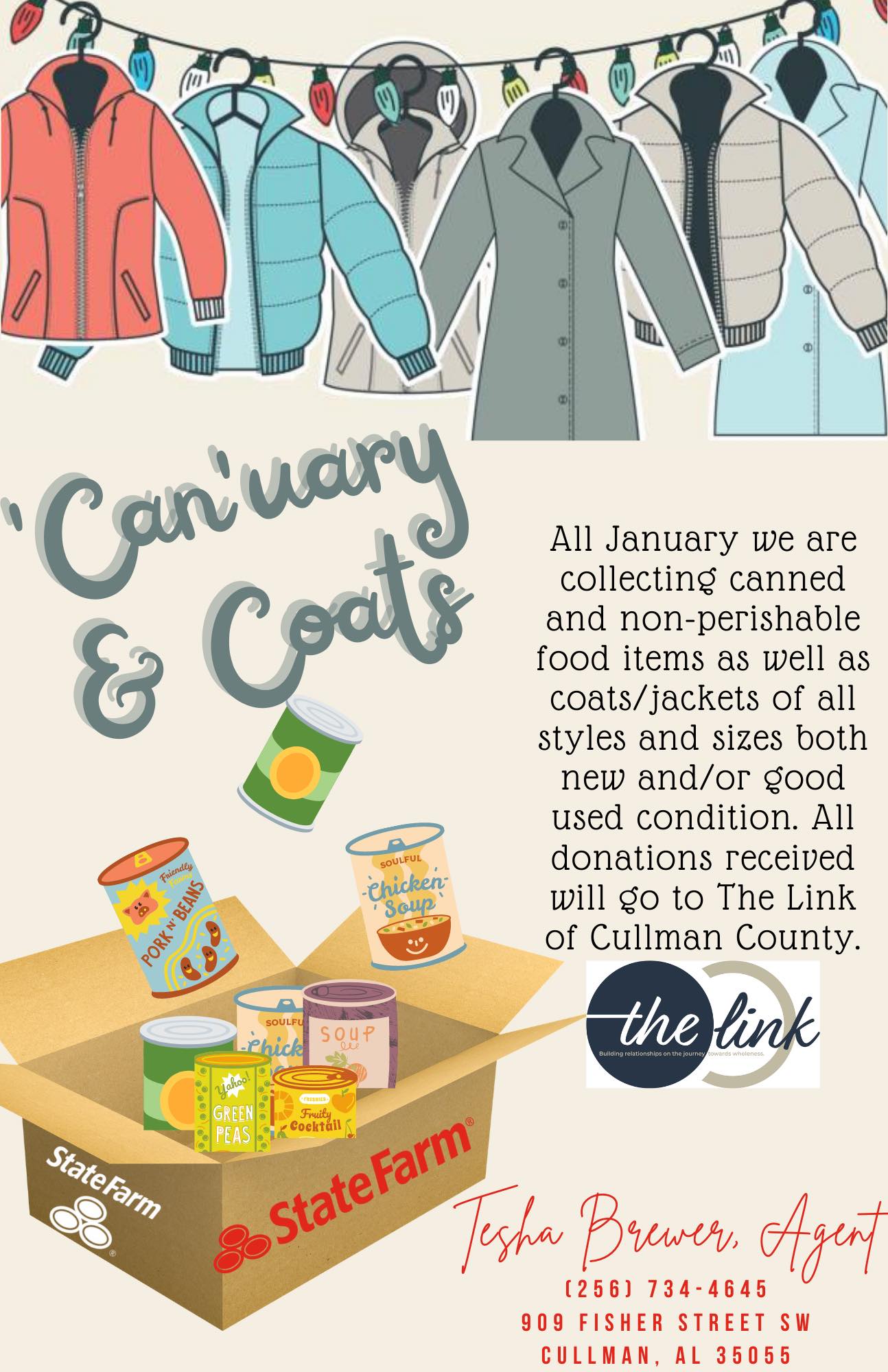 CULLMAN, Ala. – To celebrate State Farm’s 100th anniversary in June, State Farm Insurance Agent Tesha Brewer has been performing acts of service to the Cullman community in increments of 100, with a different service provided each month leading up to the anniversary. During the month of January, Brewer’s office is collecting winter outerwear and nonperishable food items to donate to The Link of Cullman County.