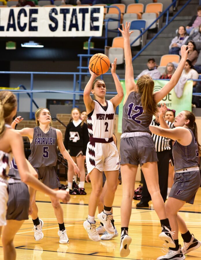 Summer Mendoza drilled a three for West Point to get things started but Emma Garcia responded with a basket on the other end to trim the lead to one. A pair of Mendoza free throws and a Fairview basket from Morgan Lindsay held the lead at one before Garcia scored again to put the Lady Aggies in front 6-5 early. A Ryleigh Jones basket put the Lady Warriors back up 7-6 and another score from Mendoza stretched the lead to 9-6. Garcia and Mendoza traded baskets on the next two possessions, but Jones knocked down a three just before the end of the first to give the Lady Warriors a 14-8 lead at the start of the second.