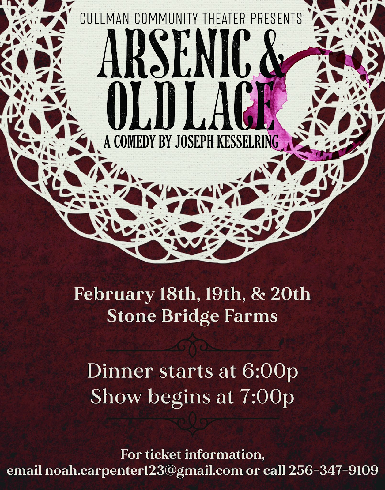 CULLMAN, Ala. – Cullman Community Theater returns with its dinner theater production of “Arsenic and Old Lace” at Stone Bridge Farms on Feb. 18-20, 2022.