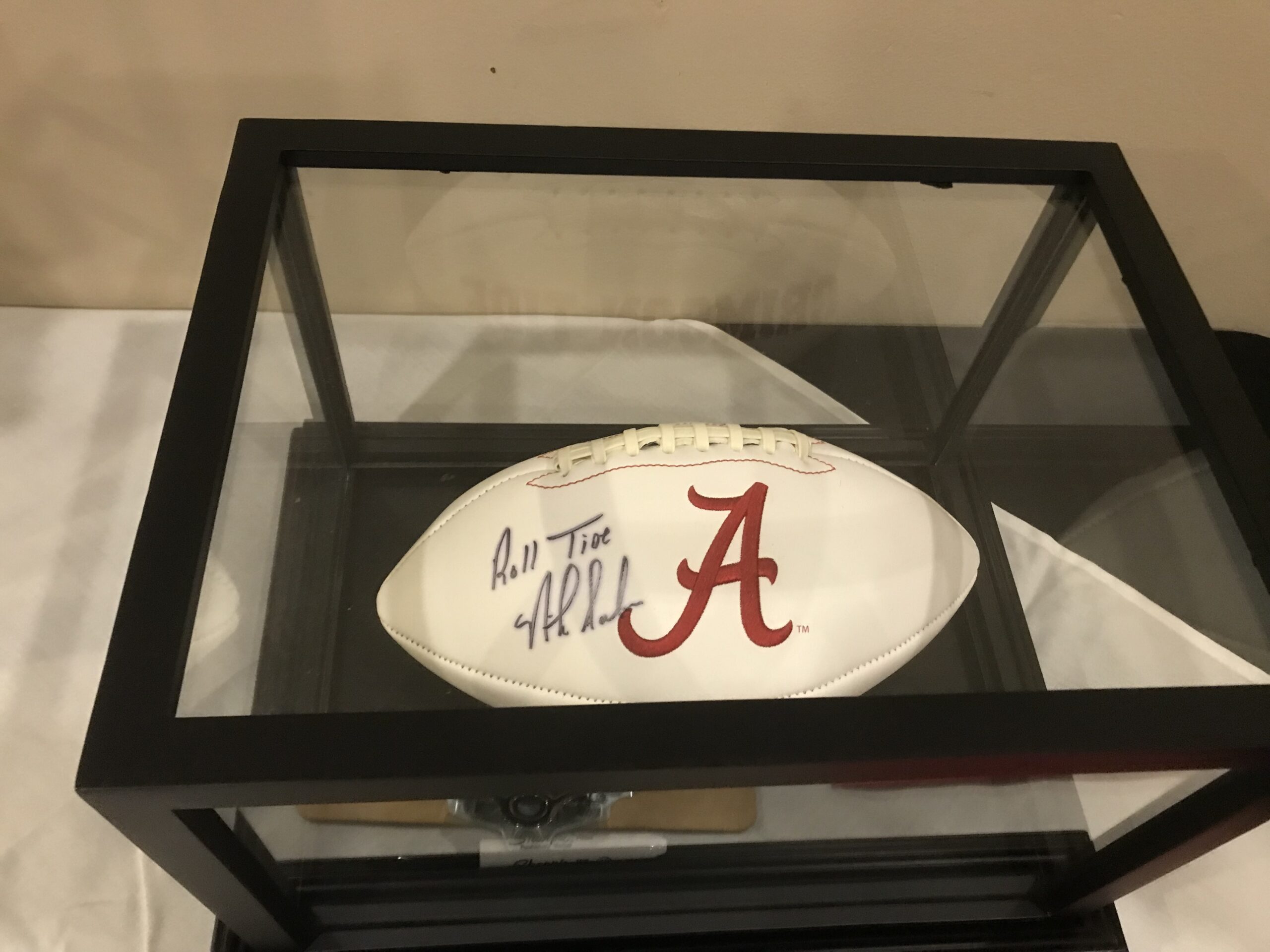 One of the silent auction items, an Alabama football signed by Coach Nick Saban, pictured Saturday evening (Sara Gladney for The Cullman Tribune)