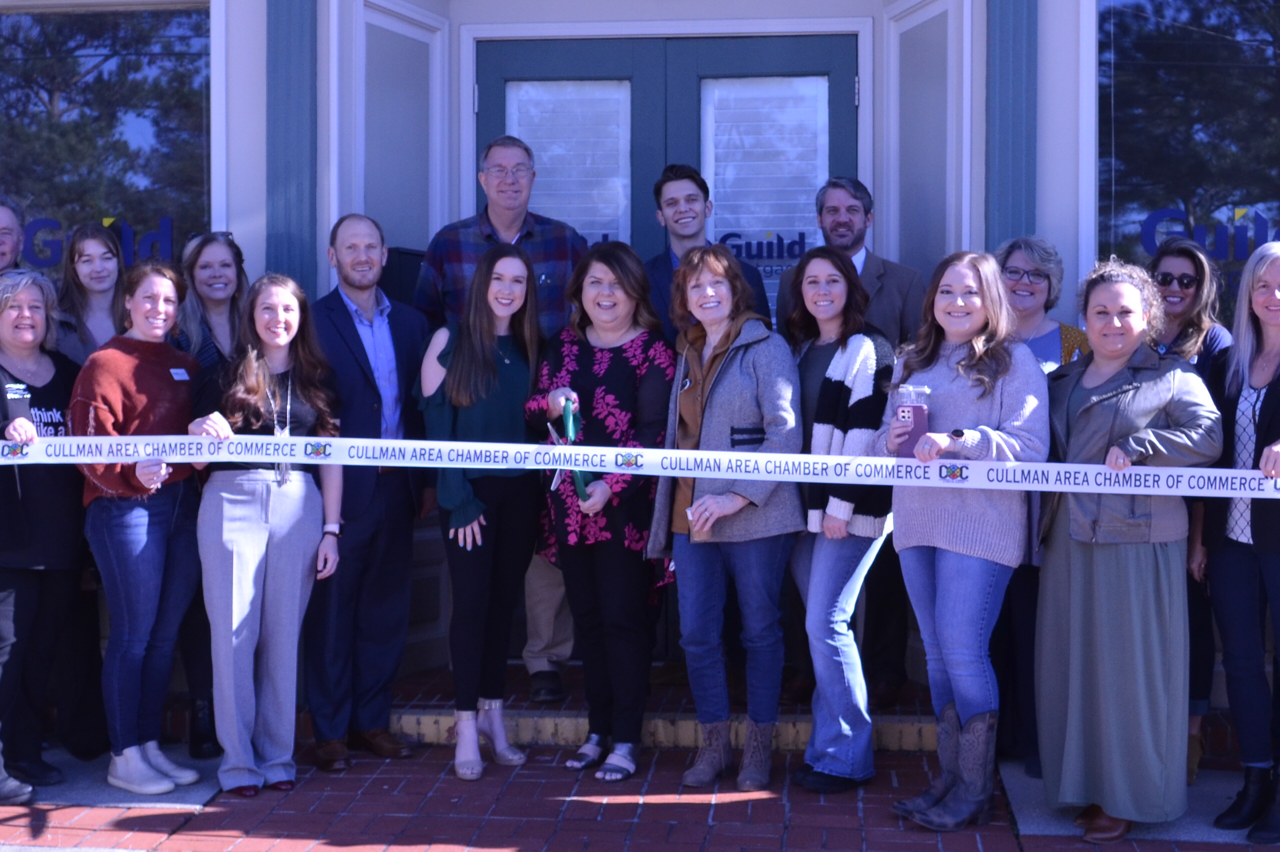CULLMAN, Ala. – The Cullman Area Chamber of Commerce, Mayor Woody Jacobs and others from within the community filled the sidewalk on First Avenue Tuesday morning to a help mark a new milestone for a local business. Guild Mortgage Company officially cut the ribbon on its new Cullman location and there was a crowd on hand to help the staff celebrate the new office, including Mayor Woody Jacobs.