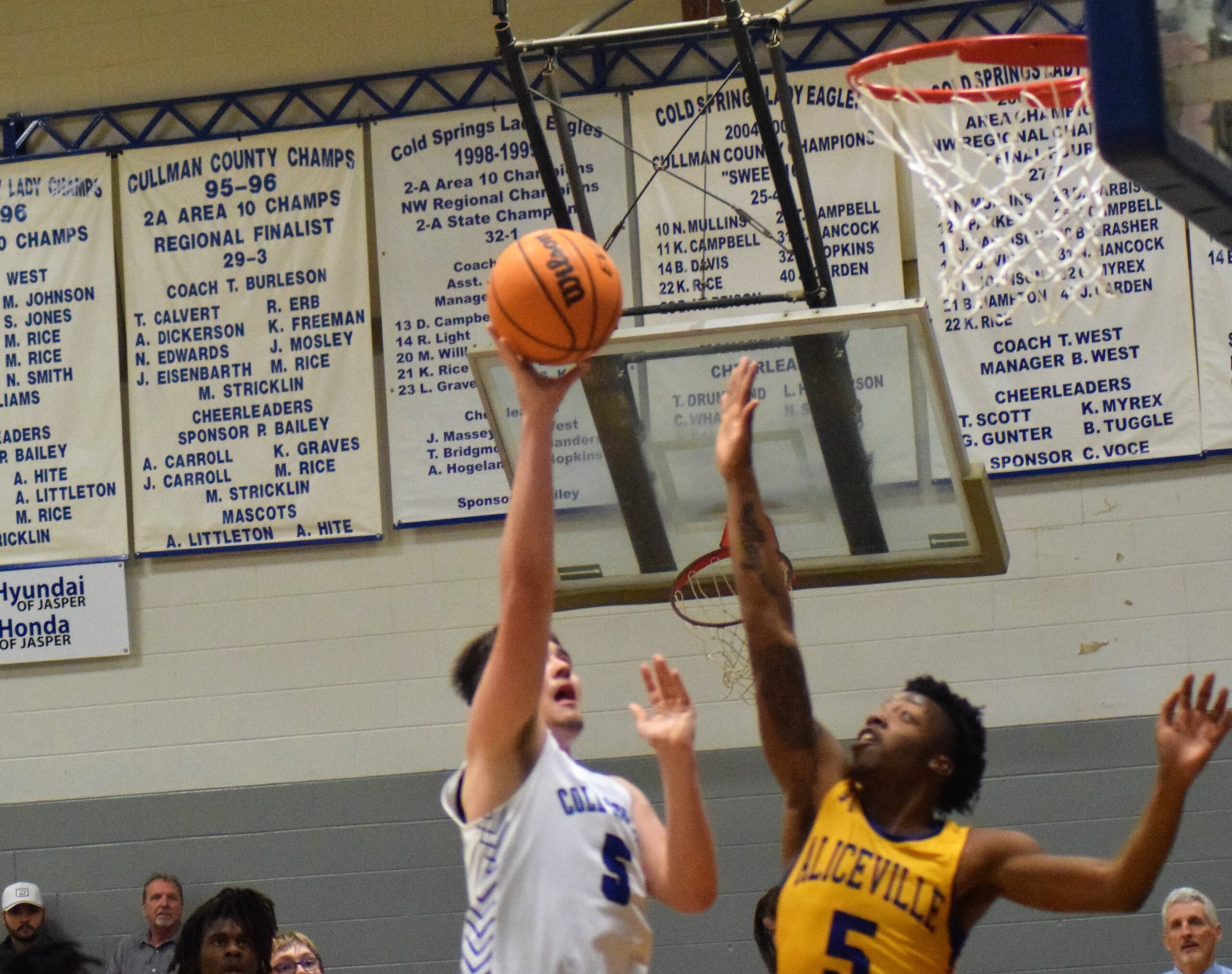 BREMEN, Ala. – After topping Addison to take the area title last week, the Cold Springs Eagles were back home Tuesday night to host a Sub-Regional matchup against Aliceville. After trailing by double-digits at the half, a late rally in the fourth quarter came up just short and Cold Springs dropped a tough game to Aliceville, 53-50.