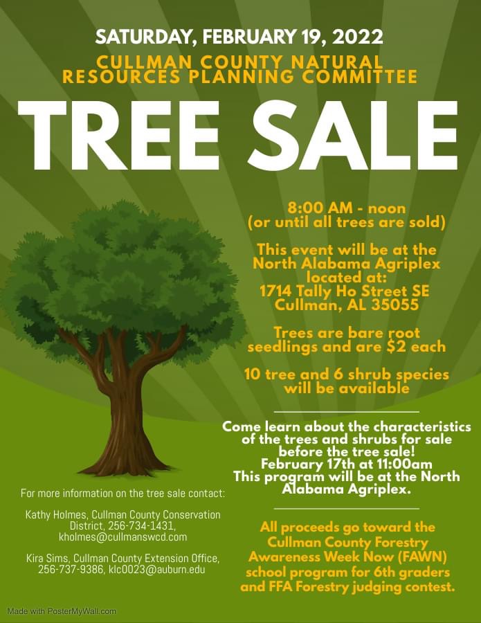 CULLMAN, Ala. – The Cullman County Natural Resources Planning Committee will be holding a tree sale Saturday, Feb. 19 at the North Alabama Agriplex, located at 1714 Tally Ho Street in Cullman. The Natural Resources Planning Committee offers landowner events throughout the year to educate the public about best management practices for different types of land. They participate in youth programs like FAWN (Forestry Awareness Week Now) which is a program that teaches sixth graders in city and county schools about facets of forestry like soils and animals. The group also sponsors the FFA Forestry judging contest. The proceeds from the tree sale will go to the FAWN and FFA programs.