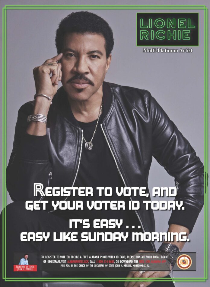 MONTGOMERY, Ala.— We are excited to announce that multi-platinum singer and songwriter Mr. Lionel Richie, a native of Tuskegee, Alabama, has agreed to participate in our 2022 photo voter ID and voter registration initiative. Mr. Richie will be, in addition to the 45th President of the United States Donald J. Trump, in this year’s promotional efforts.