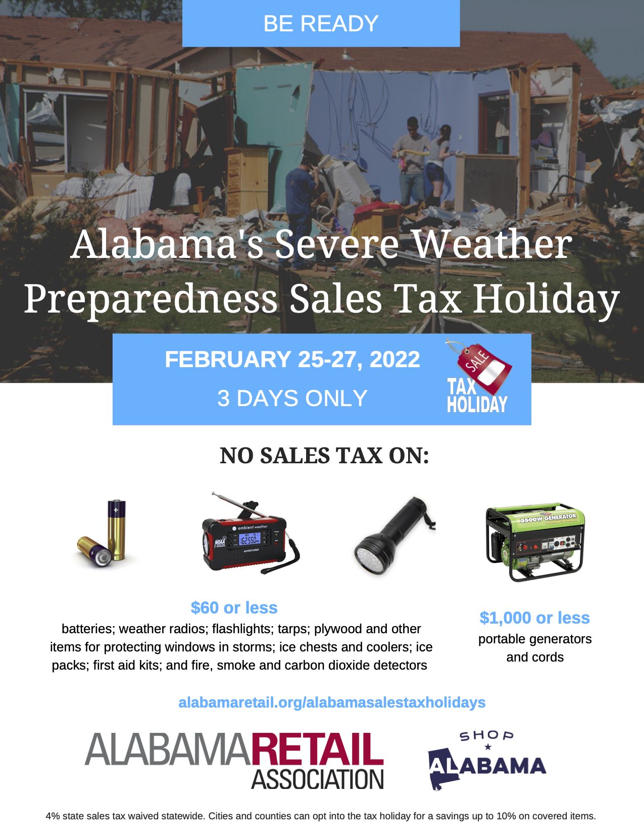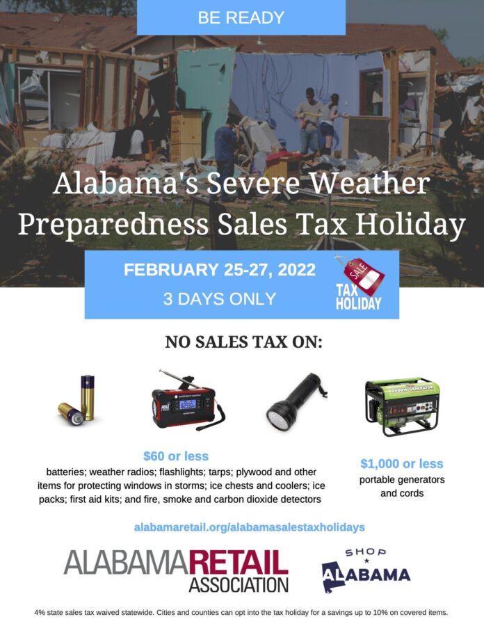 MONTGOMERY, Ala. – With seemingly constant threats of inclement weather, no matter the season, residents will be able to participate in the state’s annual Severe Weather Preparedness Sales Tax Holiday to better prepare.