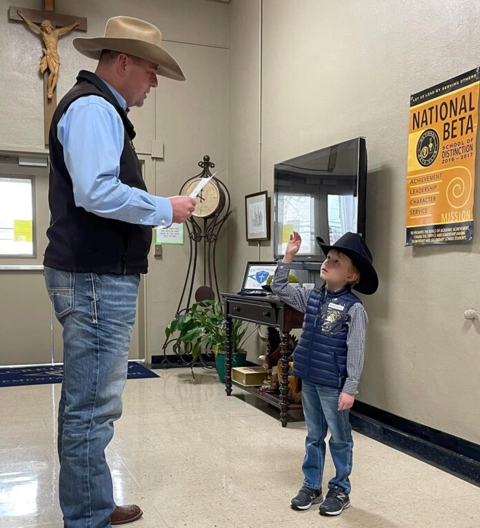 Sheriff Matt Gentry swore in 5-year-old Silas Adams as a Deputy Sheriff at Sacred Heart School.