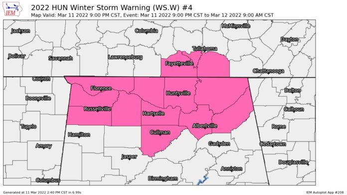 HUNTSVILLE, Ala. – IEMBot Huntsville has expanded the area of Winter Storm Warning to include Cullman County beginning Friday night from 9:00 p.m. – 9:00 a.m. Saturday morning.