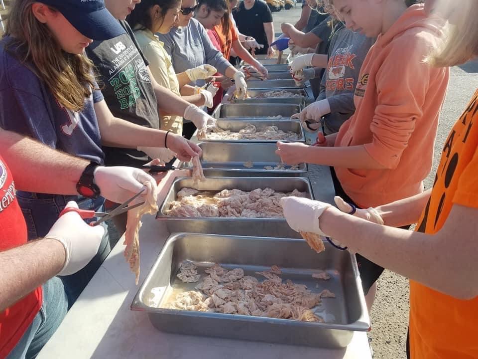 The supper is an annual fundraiser for the Meek High School band, so the band members will set up the tables and chairs in the gym and help to prepare the food. The band and band boosters clean and cut the chittlins on an early Saturday morning every year before the supper. The chittlins are boiled, pressure cooked and prepared to be breaded and fried the day of the supper. The band members will also be serving food and waiting tables the day of the supper.