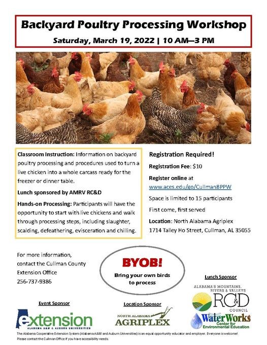 Lunch will be provided by Alabama’s Mountains, Rivers & Valleys (AMRV) and Resource Conservation and Development (RCD) Council. Registration is $10 and can be completed online at Backyard Poultry Processing Workshop – Alabama Cooperative Extension System (https://www.aces.edu/event/backyard-poultry-processing-workshop/). For further questions, contact the Extension office at 256-737-9386.