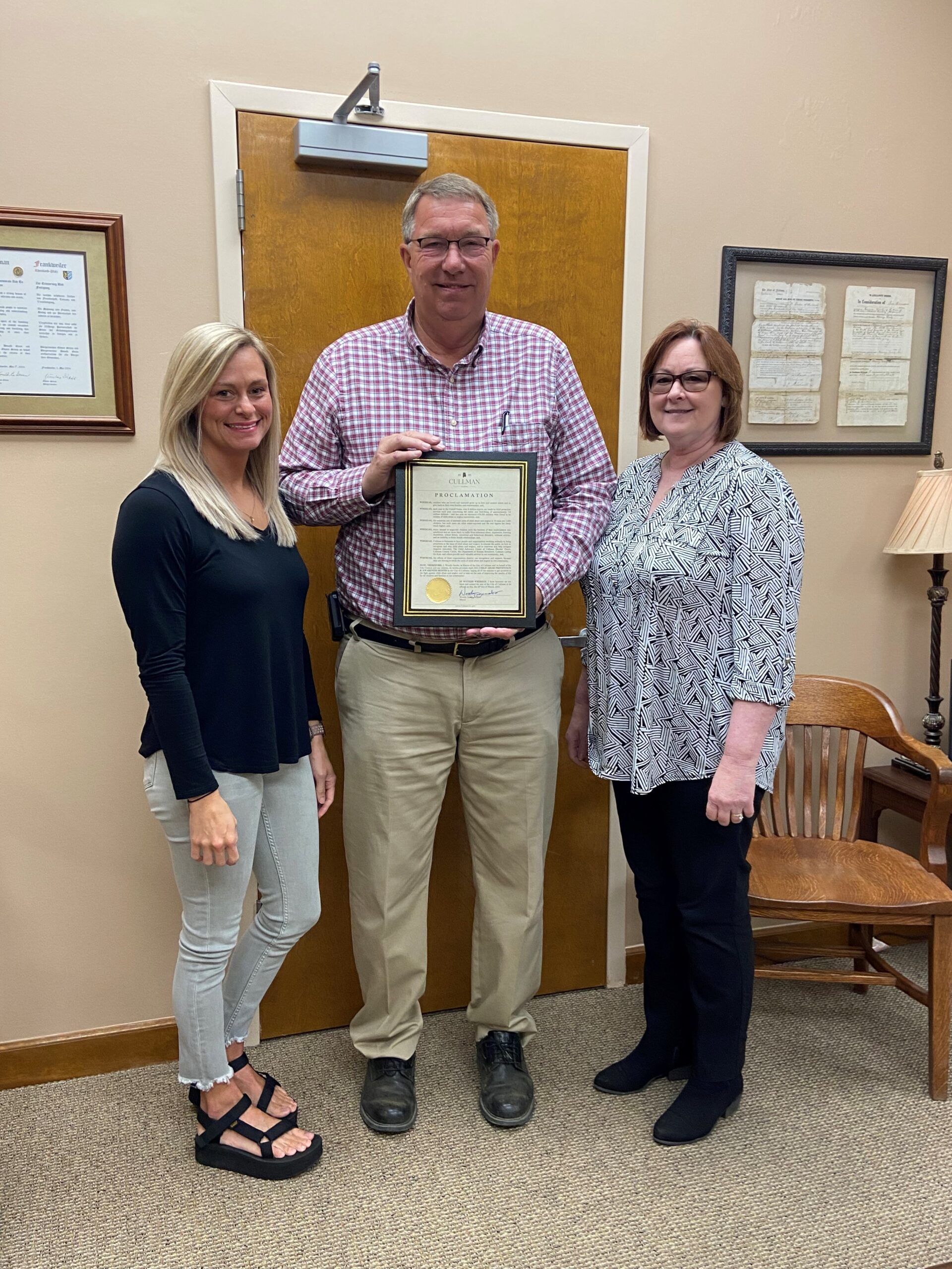 Brooks’ Place Executive Director Gail Swafford (right) and Family Advocate Haley Harris (left) with Mayor Jacobs at the Proclamation Presentation on March 28, 2022. (Photo courtesy of The City of Cullman)