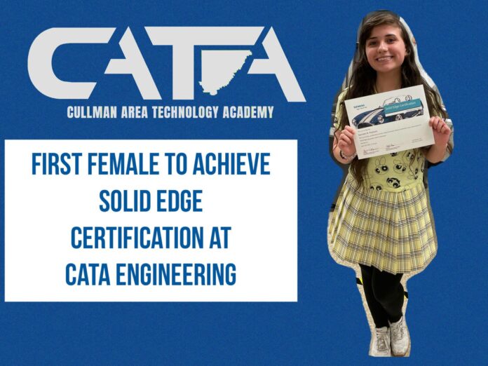 CULLMAN, Ala. – Cullman Area Technology Academy (CATA) student and Holly Pond sophomore Kursten Putman is the first ever female student to pass the Siemens Solid Edge Association Level Certification Exam offered in the CATA engineering technology program. Solid Edge is an industry recognized exam that tests the skills and knowledge of students who use Solid Edge Software. Solid Edge provides a complete portfolio of product development tools for mechanical and electrical design, simulation, manufacturing, technical publications, data management and more.