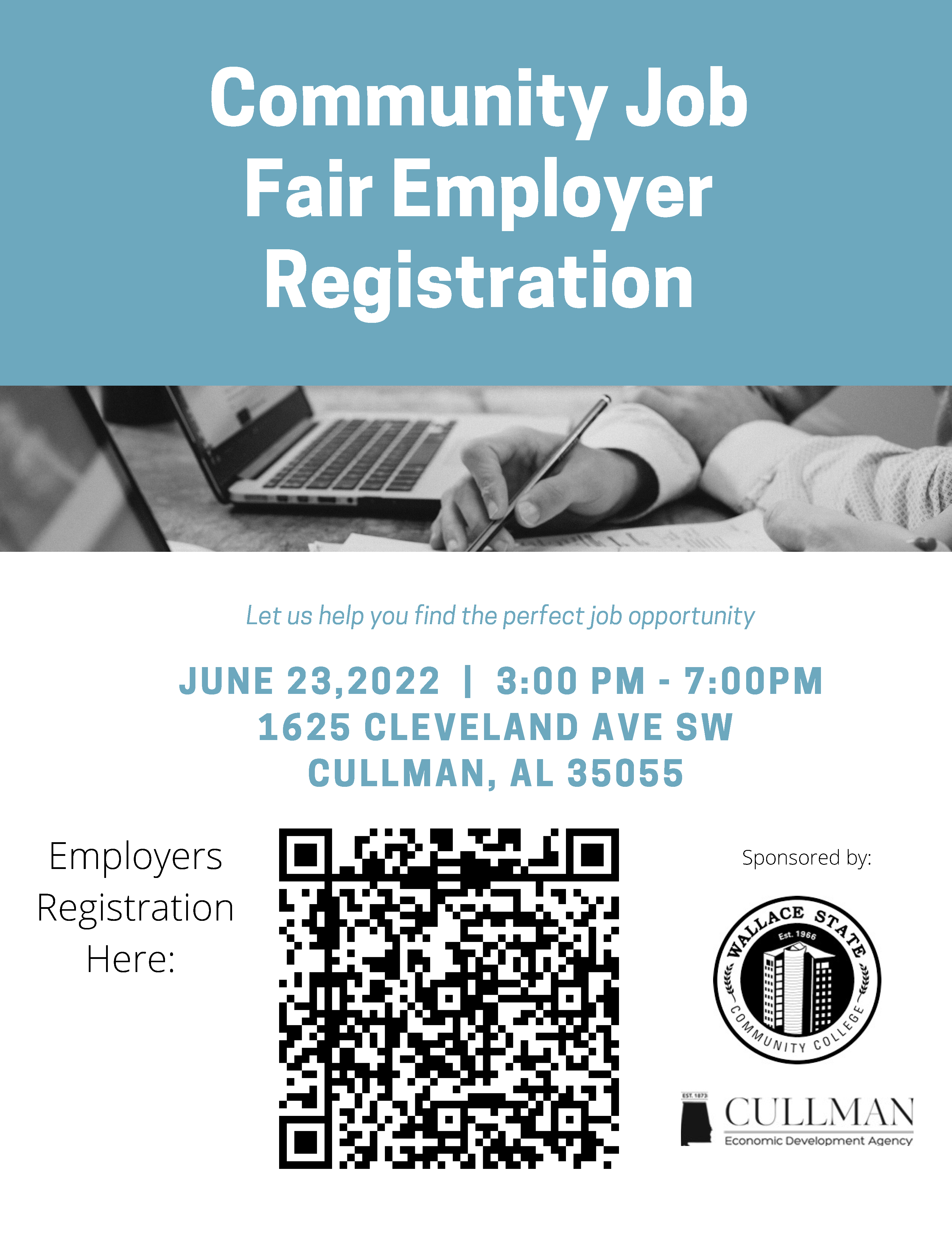 CULLMAN, Ala. – Wallace State’s Center for Career and Workforce Development has partnered with Cullman Economic Development Agency to sponsor a Community Career Fair which will be held at the Active Adult Center (formerly the Donald E. Green Senior Center) on Thursday, June 23 from 3:00 p.m. – 7:00 p.m. Wallace State students are invited to the fair and anyone actively seeking employment is welcome to attend. Employers with open positions can also register for an opportunity to find an employee with the skills to meet their needs.