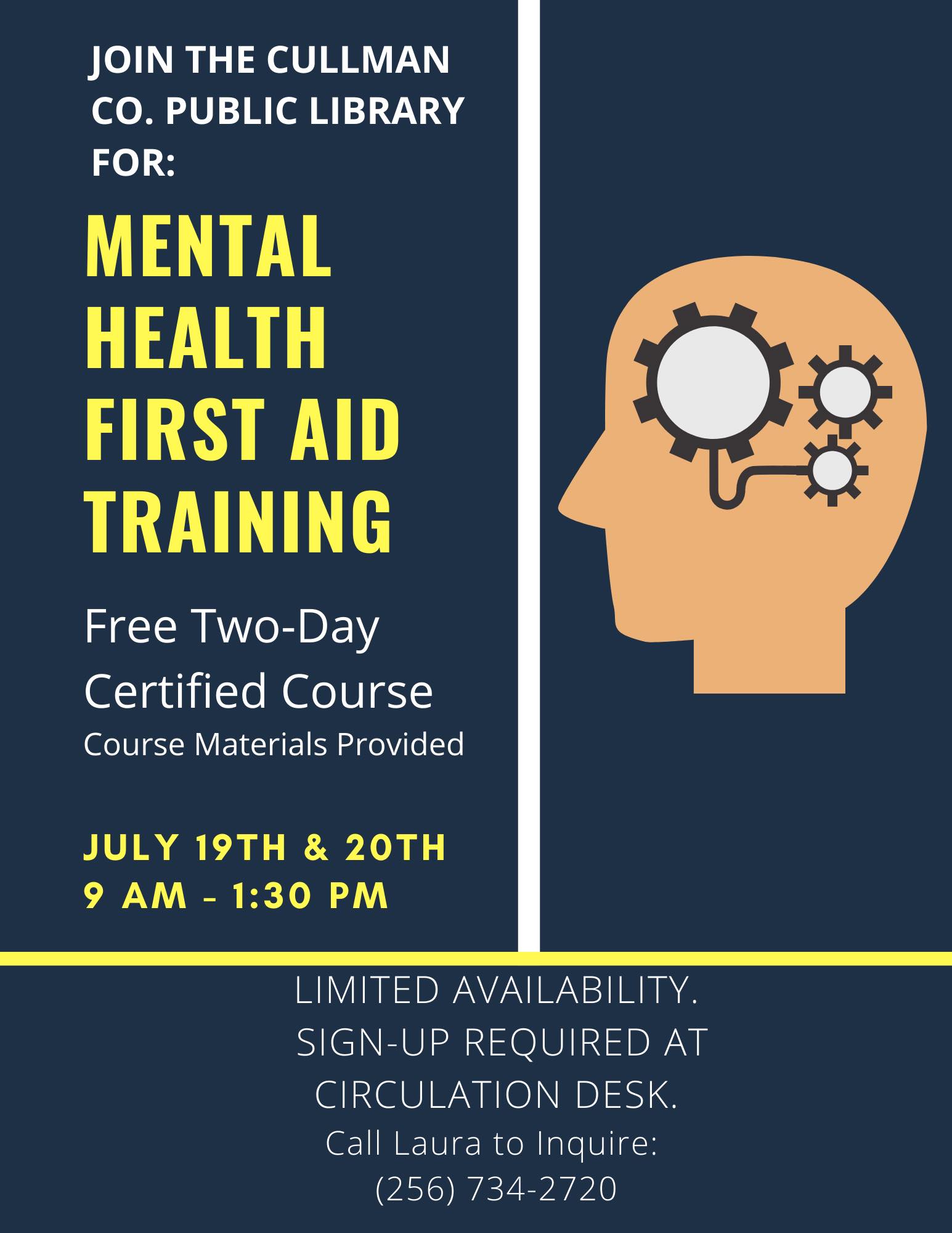 CULLMAN, Ala. – The Cullman County Public Library will be hosting a Mental Health First Aid training course Tuesday, July 19 and Wednesday, July 20 from 9:00 a.m. – 1:30 p.m. There is no cost for the training or materials as it is a grant-based program from the Alabama Department of Mental Health.