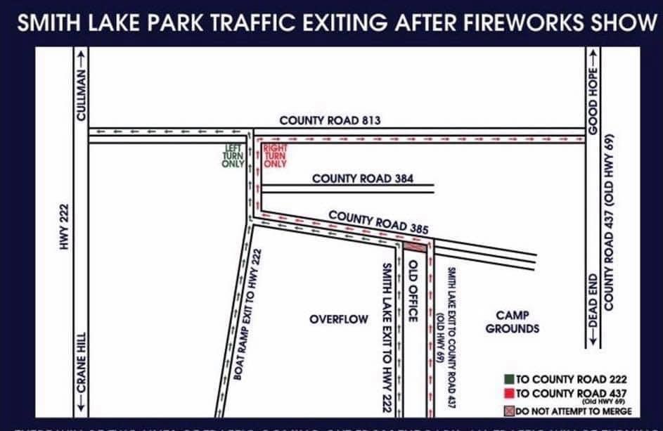 CULLMAN, Ala. – The Cullman County Sheriff’s Office (CCSO) will be responsible for traffic control following the fireworks show at Smith Lake Park today, July 4, 2022.