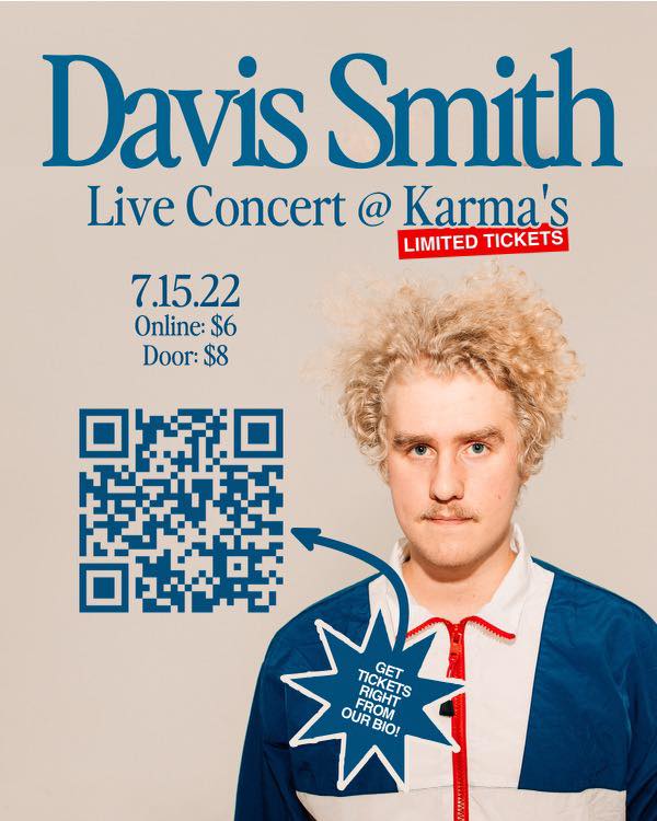 Smith’s website biography reads: Checking a box that many indie artists do today, Davis began producing music as a teenager in his bedroom. What began as covers of Owl City and John Denver became original singles crafted from raw emotion, such as “If I Do,” “Annika,” and “Right About Us,” a collaboration with Destin, Florida’s Skylar Capri. Davis is set to release his debut album in the summer of 2022. He began booking house shows after refining his songwriting, playing across the mid-south and opening for artists such as Jordy Searcy, Goldpark, and Take Lead.