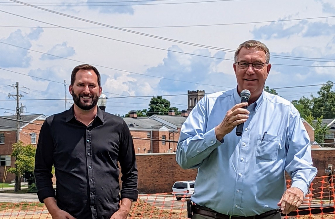 Cullman Parks, Recreation & Sports Tourism Executive Director Nathan Anderson, left, and Cullman Mayor Woody Jacobs, right, are all smiles Thursday, Aug. 18, 2022, as they announce that the fundraising goal for the city’s new skatepark has been met. (Amy Leonard for The Cullman Tribune)