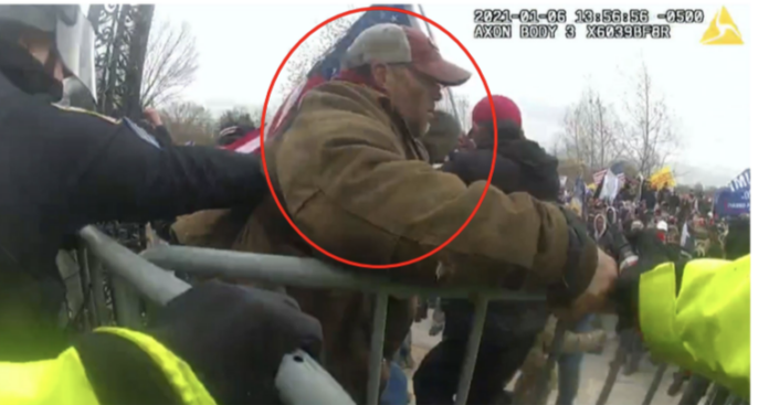 Later that day, at approximately 4:20 pm, law enforcement officers formed a line and attempted to clear the area near the Senate Wing doors. Russell refused orders to leave the area and pushed his back and buttocks into the riot shields of several officers. He then turned around to face one officer and declared, “I’m not scared of you and I’m not weak.”