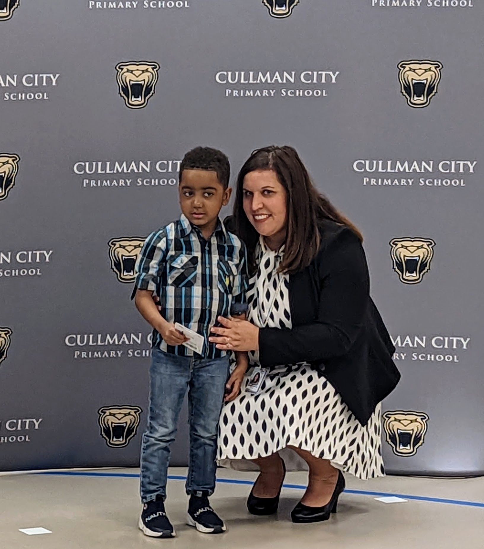 Superintendent Kyle Kallhoff explained, “Kasseus is a kindergarten student in the Bunny class at Cullman City Primary School. He was born with sickle cell disease, which is a blood cancer that turns red blood cells into a sickle shape resulting in pain. The Coleman family moved to Cullman following the realization of the number of procedures and hospital visits Kasseus would undergo. His brother Azreal was a perfect match for his bone marrow transplant and was willing to donate bone marrow at a young age. At the time, Kasseus was in pre-k but had to miss throughout the year due to his health. Kasseus has undergone a bone marrow transplant and chemo and was able to start, at the beginning of the school year, in kindergarten at CCPS. Mrs. Marshall describes Kasseus as a precious student. She goes on to say that anyone who is around him loves him. He has already learned almost all of his letters and knows every sound. In addition, he knows his numbers. CCPS faculty and staff are thrilled that he has had a successful start to the school year and, according to his family, Kasseus has a light so bright inside of him. His mom would like to thank the prayer warrior family and friends and CCPS as a whole.”