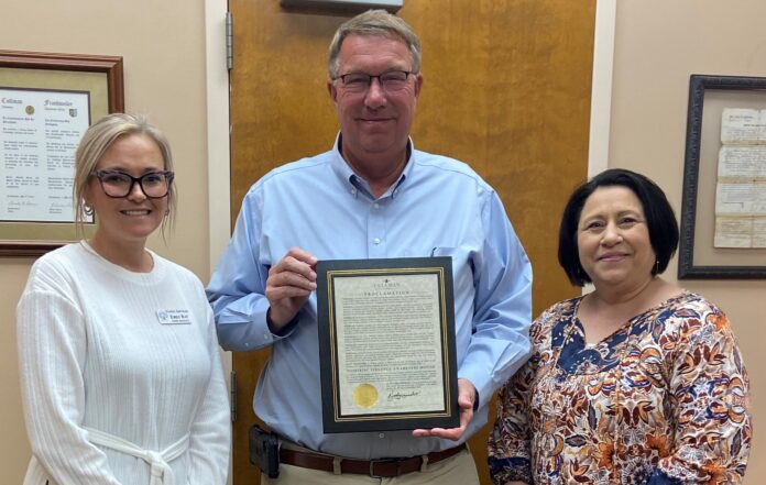 On Wednesday, September 28, 2022, Mayor Woody Jacobs officially proclaimed the month of October 2022 Domestic Violence Awareness Month (DVAM) in the City of Cullman. On hand to accept the proclamation from Victim Services of Cullman, Inc. (VSOC) were Jonna Wimburn, Prevention Educator, and Emily Ray, Court Advocate and SAIL (Special Assessment Intervention and Liaison) Specialist.