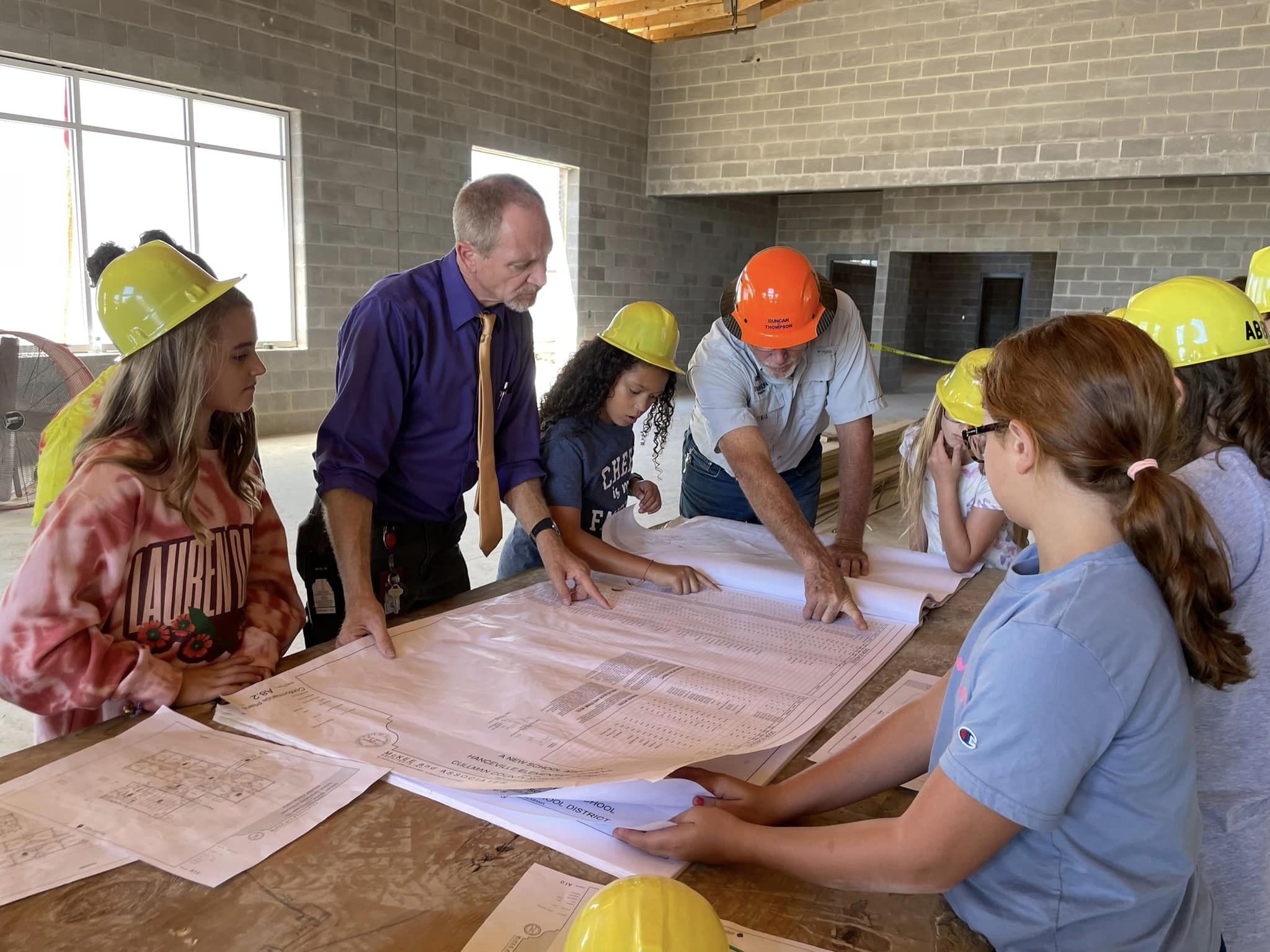 Hanceville Elementary School fifth graders survey school building plans with math teacher Mark Armstrong and a member of the construction crew. (Jocelyn Logan)