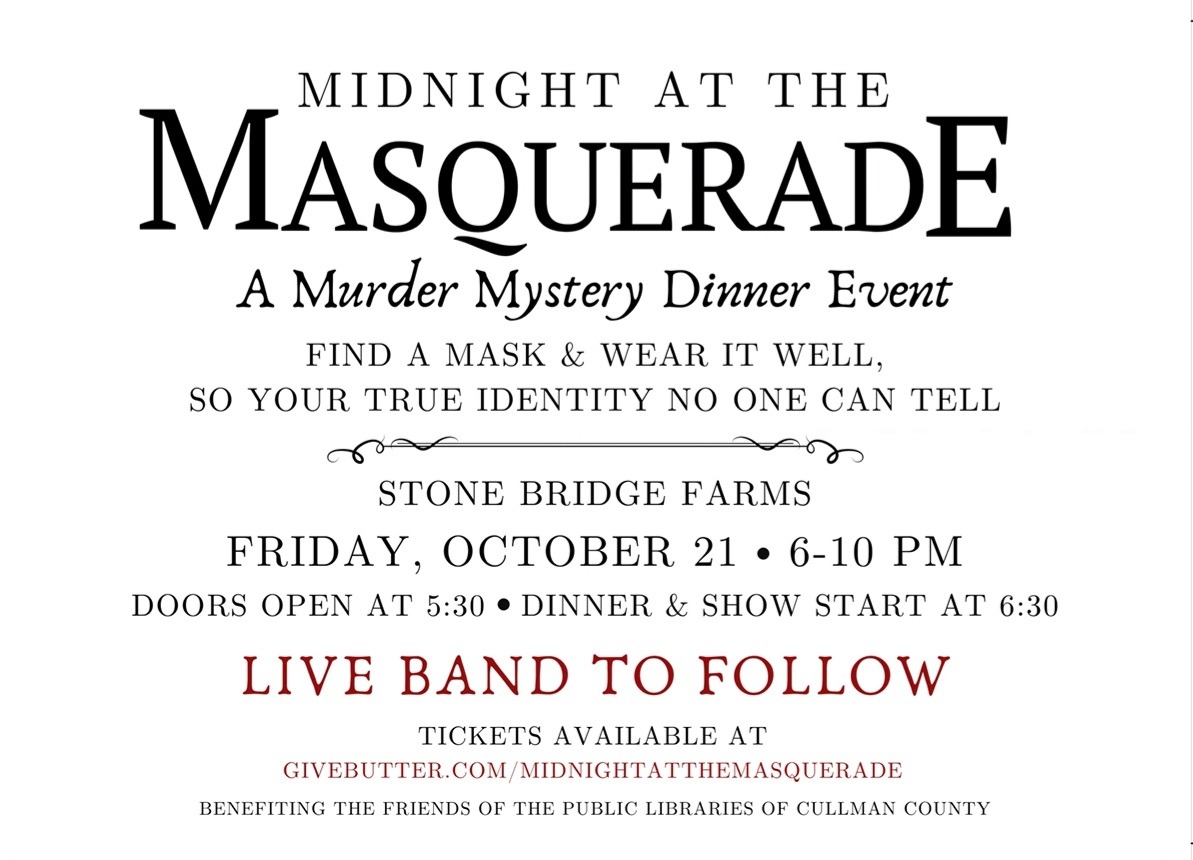 CULLMAN, Ala. – The Friends of the Public Libraries of Cullman County (FPLCC) will host Midnight at the Masquerade, a murder mystery dinner event at the Browne Stone Centre at Stone Bridge Farms on Friday, Oct. 21, from 6-10 p.m. Doors will open at 5:30 and dinner and the show start at 6:30.